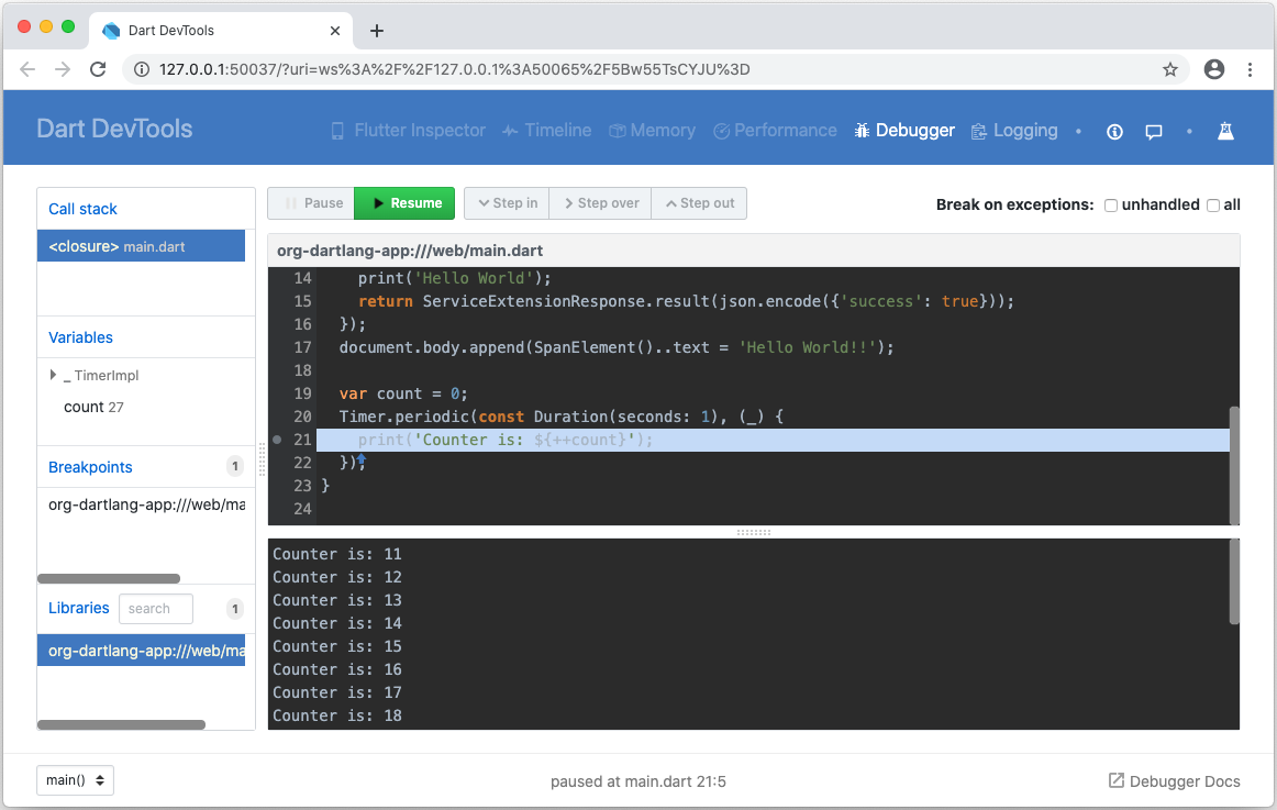 This section leads you through the basics of using Dart DevTools to debug a web app. If you already have an app that’s ready to debug, you can skip creating the test app (step 1), but you’ll need to adjust the instructions to match your app.